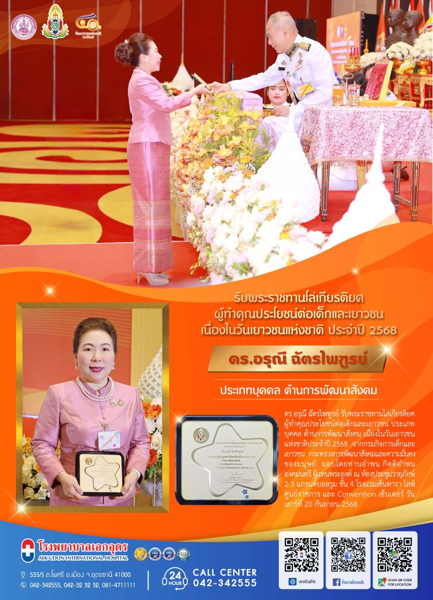 รับพระราชทานโล่เกียรติยศ ผู้ทำคุณประโยชน์ต่อเด็กและเยาวชน เนื่องในวันเยาวชนแห่งชาติประจำปี 2568