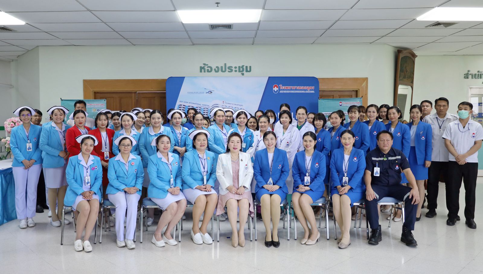 ดร.อรุณี ฉัตรไพฑูรย์ ผู้อำนวยการโรงพยาบาลเอกอุดร (แถวนั่งสูทขาว) ให้เกียรติกล่าวเปิดการอบรม และถ่ายภาพร่วมกับผู้จัดการ หัวหน้าแผนก และพนักงานโรงพยาบาลเอกอุดร ในการอบรม Aek Udon Quality’s Day เพื่อให้ความรู้และพัฒนาการบริการอย่างมีมาตรฐานอย่างต่อเนื่องแก่พนักงานทุกคน เน้นความปลอดภัย และความพึงพอใจของผู้รับบริการ ซึ่งจัดขึ้นจำนวน 4 รุ่น ณ ห้องประชุมใหญ่ชั้น 4 โรงพยาบาลเอกอุดร เมื่อวันที่ 24-25 มีนาคม 2569