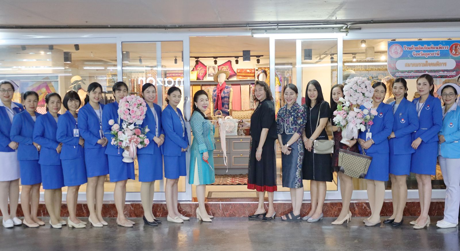 ท่านอลิศรา มานะจิตต์ อธิบดีผู้พิพากษาศาลแรงงานภาค 4 (คนที่ 10 จากซ้าย), ดร.อรุณี ฉัตรไพฑูรย์ ผู้อำนวยการโรงพยาบาลเอกอุดร (คนที่ 9 จากซ้าย) และคณะ ให้เกียรติตัดริบบิ้นร่วมถ่ายภาพและมอบช่อดอกไม้แสดงความยินดีเนื่องในโอกาสเปิดร้านใหม่สาขาโรงพยาบาลเอกอุดร เมื่อวันที่ 20 มีนาคม 2569